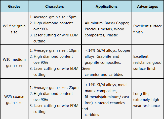 Advantages of PCD tool blanks: 1. Long working life. 2. Uniform surface finish. 3. Reduces machine down time. 4. Highly improved work piece quality and excellent dimensional control. 5. Increase productivity. 6. High material removal rate. 7. Lower cost per piece. 8. The working life of a PCD cutting edge is usually 50 to 250 times longer than that of traditional sintered carbide cutting tools.