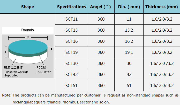 The standard shape of RJ PCD Cutting Tool Blanks is round. Other shapes, such as rectangle, triangle, square, semi-circle and so on, can also be customized per customers' requirements.