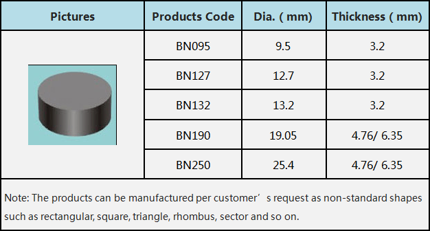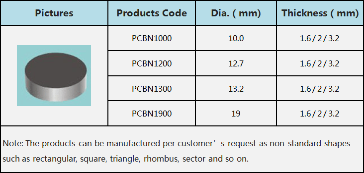 The standard shape of RJ PCBN Cutting Tool Blanks is round. Other shapes, such as rectangle, triangle, square, semi-circle and so on, can also be customized per customers' requirements.