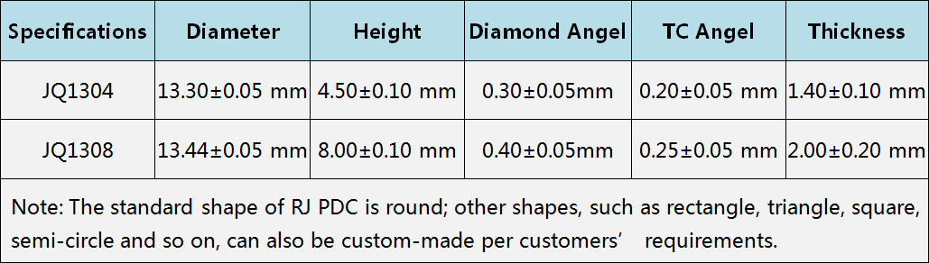 RJ PDC are produced with carefully chosen high-quality industrial diamond and tungsten carbide materials as well as advanced synthesizing technology, combining the strengths of both diamond and tungsten carbide, so they are widely used for various drilling tools such as petroleum bits, mining bits, geological drilling bits, and other rock cutting and processing tools.